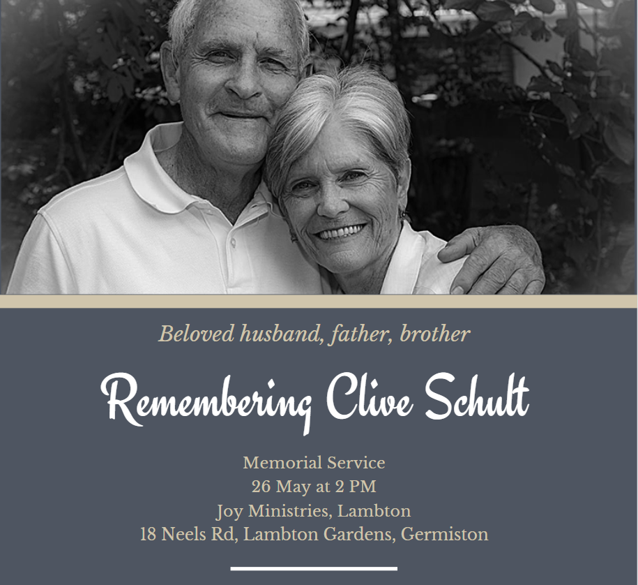 The memorial service will be held on Friday 26 May 2023, starting at 2pm at Joy Ministries in Lambton.